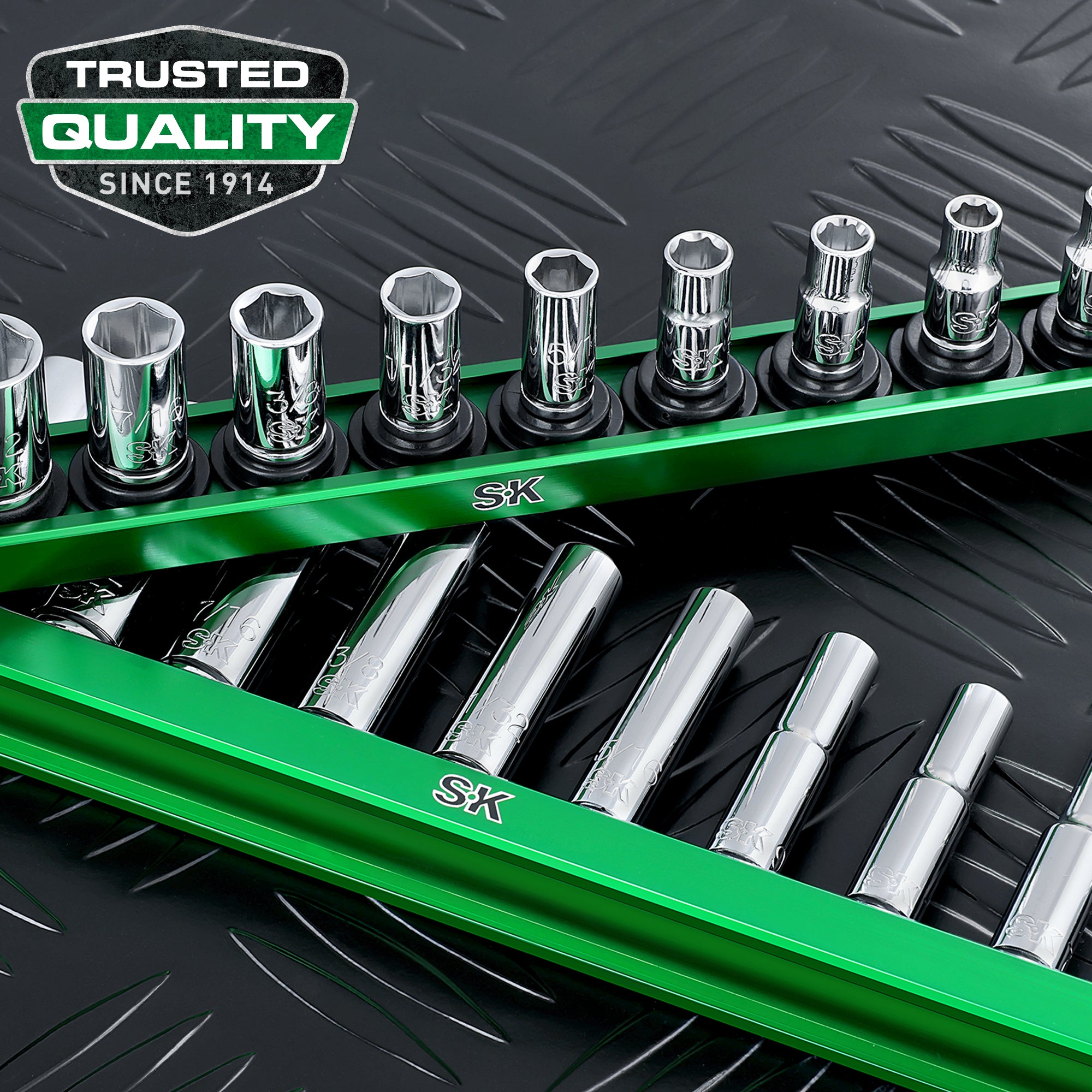 - Aluminum storage rail to keep sockets organized, ball bearings to secure them in place, and 360° rotating socket clips for easy identification.