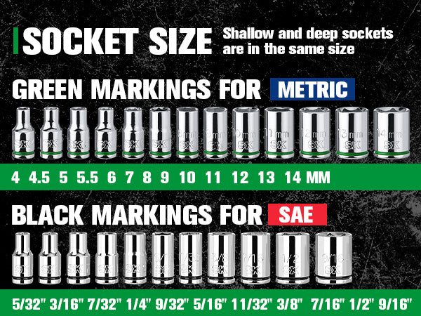- Socket sizes include: 4mm - 14mm & 5/32" - 9/16", with visible size markings and color-coded rings for easy identification. Tools include: 1/4" drive 216-position ratchet, 2" & 6" extensions, and a universal joint.