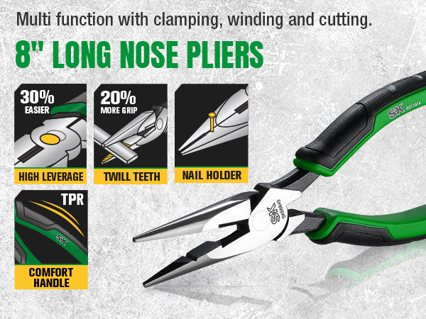 - Set Includes: 8" Diagonal Cutting Pliers, 9.5" Linesman Pliers, 8" Long Nose Pliers, 10" Tongue & Groove Pliers, 8" Slip-Joint Combination Pliers.
