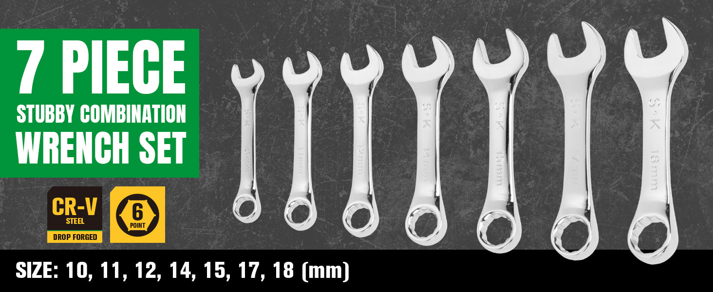 - Set Includes: 10mm, 11mm, 12mm, 14mm, 15mm, 17mm, 18mm short combination wrenches packaged in a wrench roll.