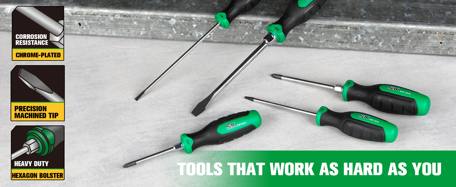 - 1/4" x 3", 3/16" x 3", 5/16" x 4", 3/16" x 6" slotted screwdrivers