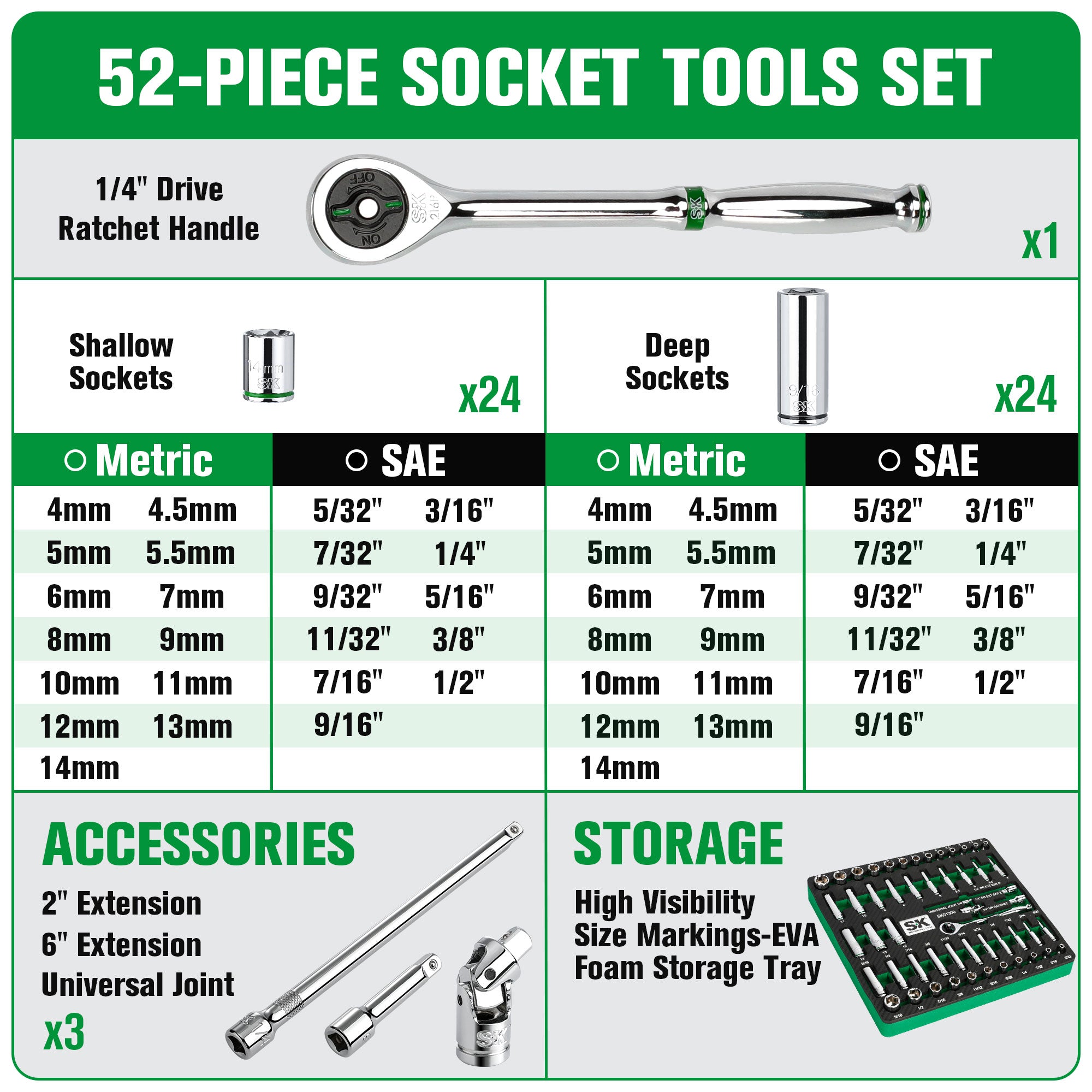 - 1/4" Drive, 52 Piece, 6 Point, Shallow & Deep, SAE & Metric Chrome Socket Set