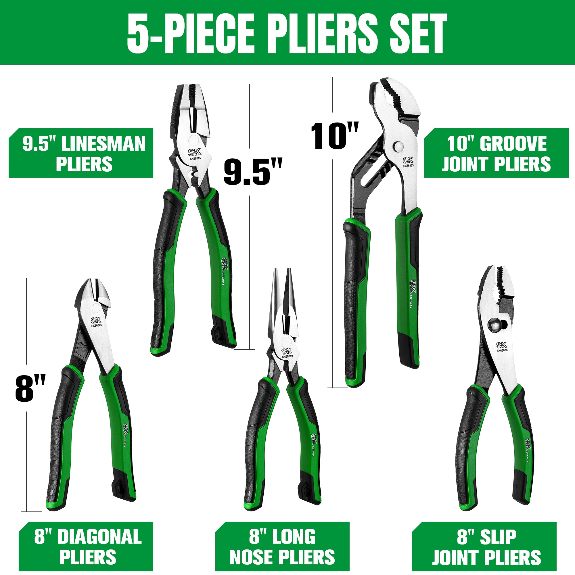 - Set Includes: 8" Diagonal Cutting Pliers, 9.5" Linesman Pliers, 8" Long Nose Pliers, 10" Tongue & Groove Pliers, 8" Slip-Joint Combination Pliers.