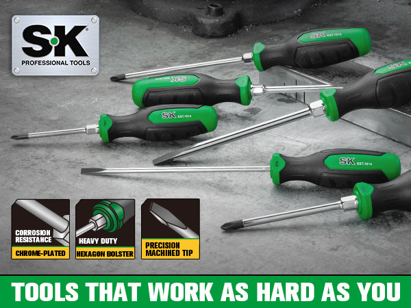 • 3/16" x 6", 1/4" x 4", 5/16" x 6" slotted screwdrivers