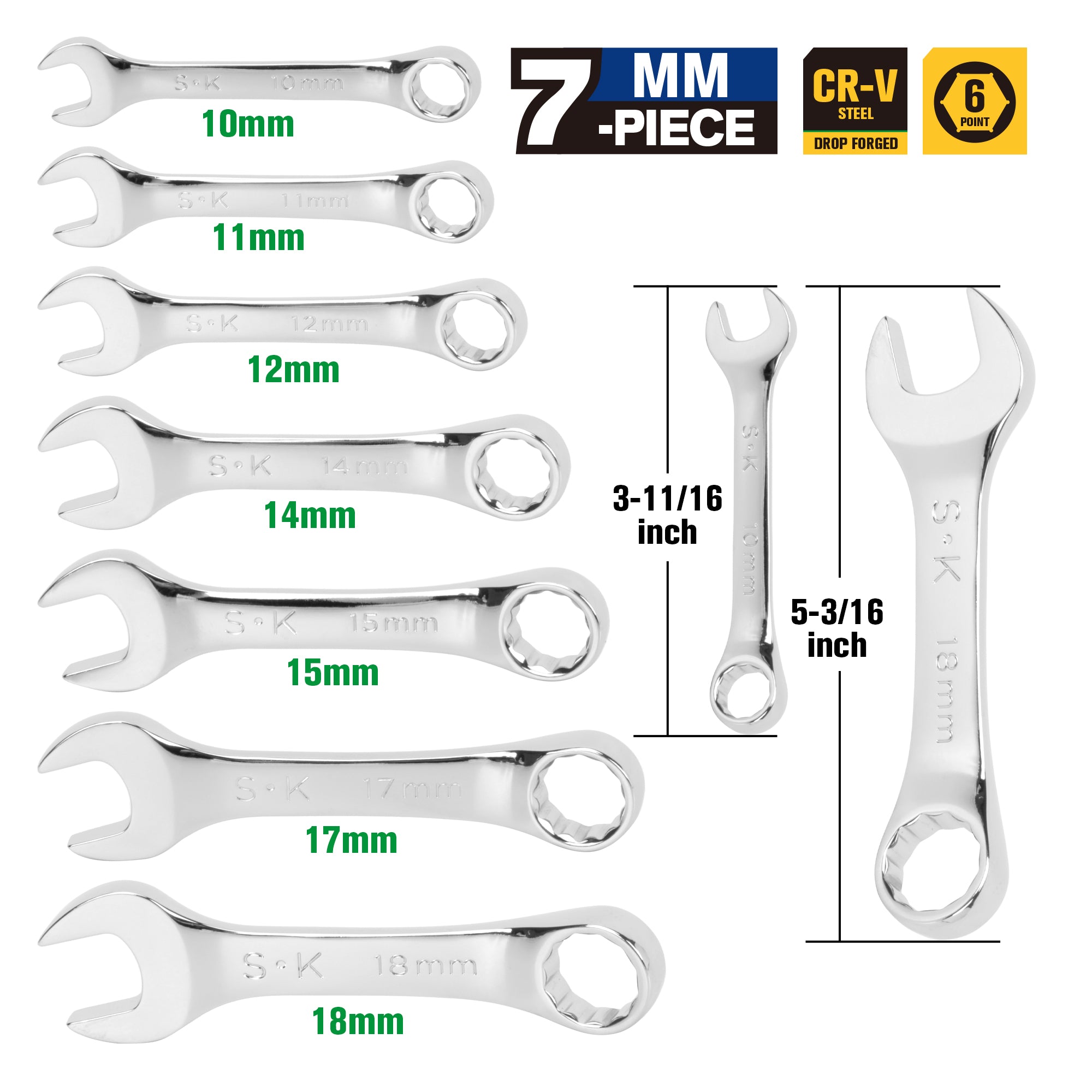 - Set Includes: 10mm, 11mm, 12mm, 14mm, 15mm, 17mm, 18mm short combination wrenches packaged in a wrench roll.
